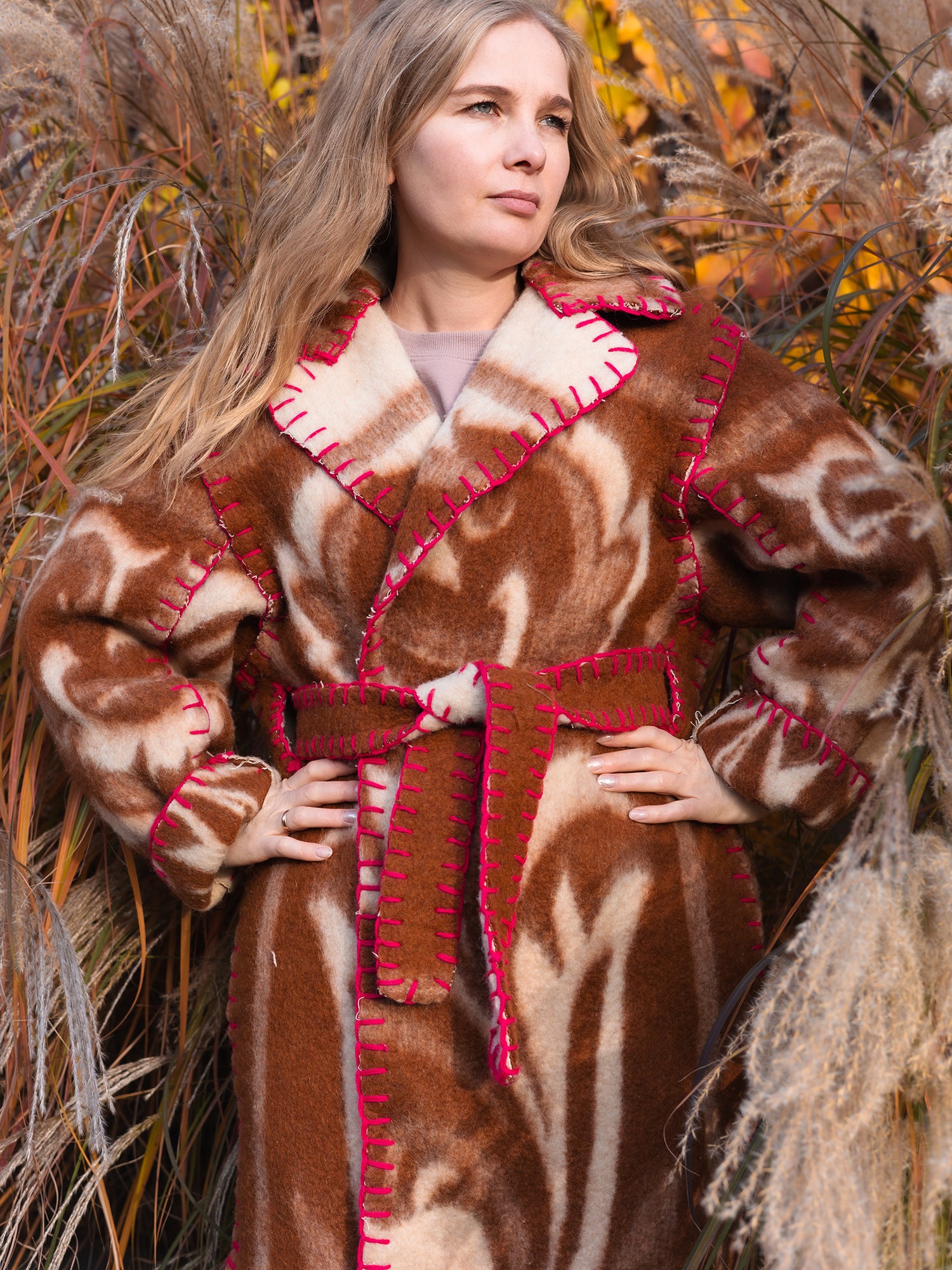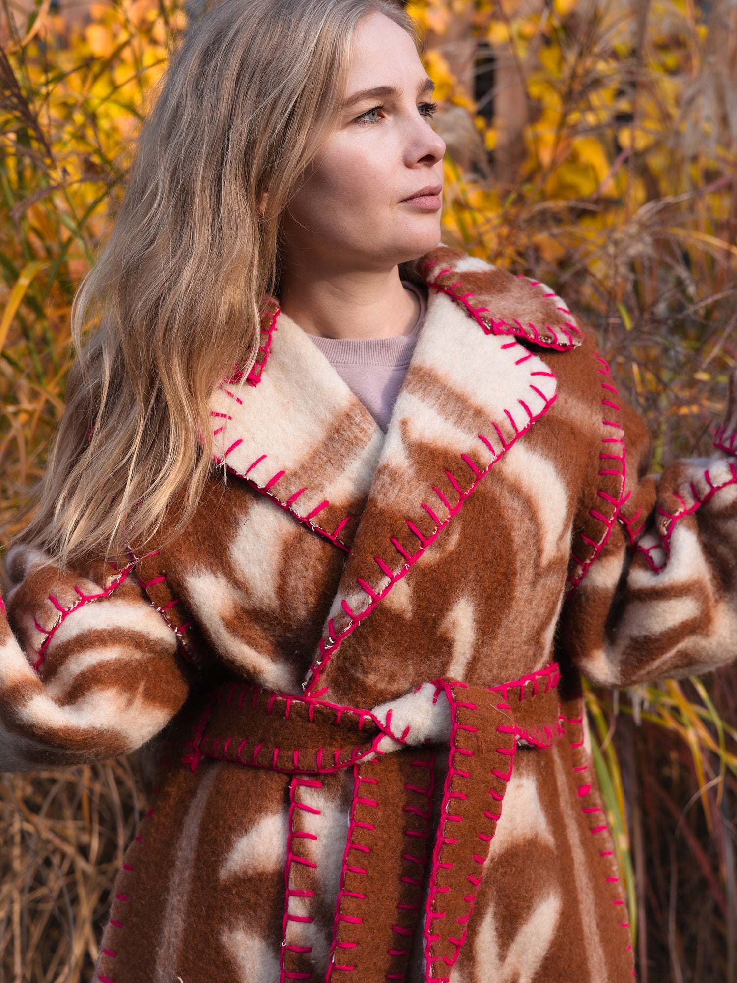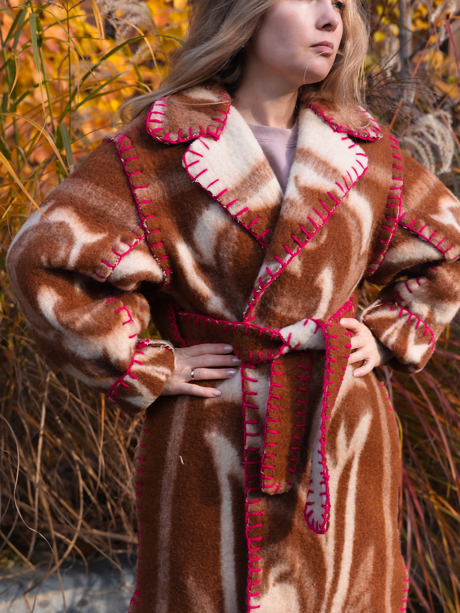 - Upcycled Blanket Coat – full-length coats crafted from repurposed wool blankets.