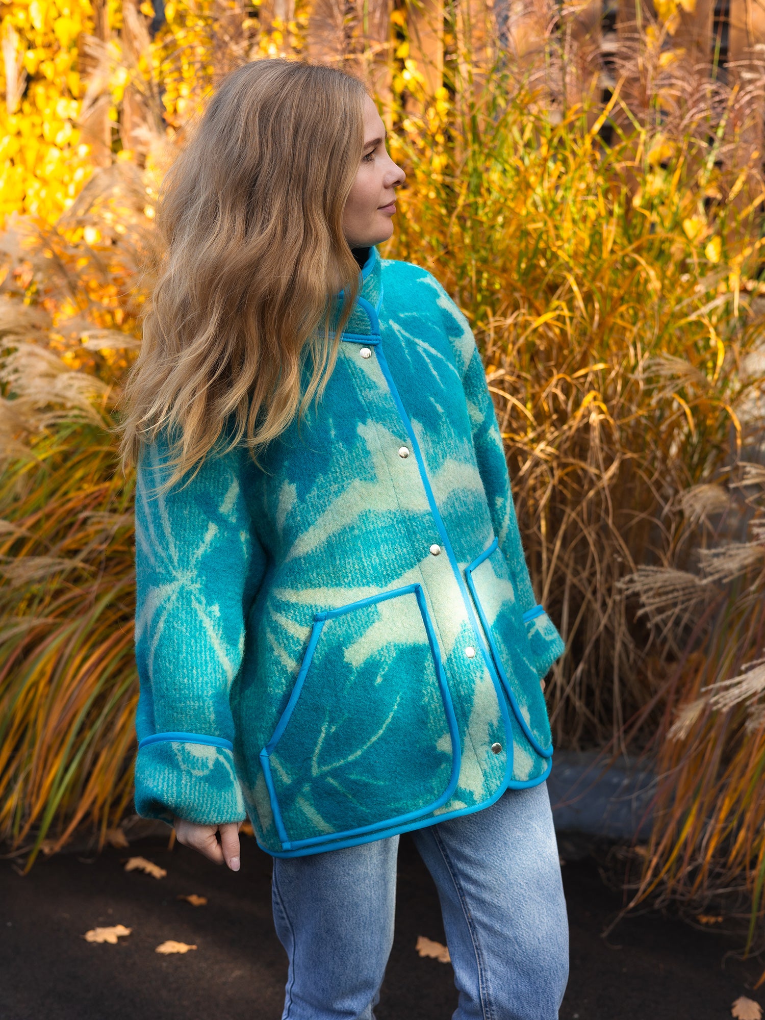 This one-of-a-kind jacket features a stunning abstract turquoise and seafoam blue pattern, accented by bold piping for a clean, structured look. Designed to be worn oversized for ultimate comfort and layering.