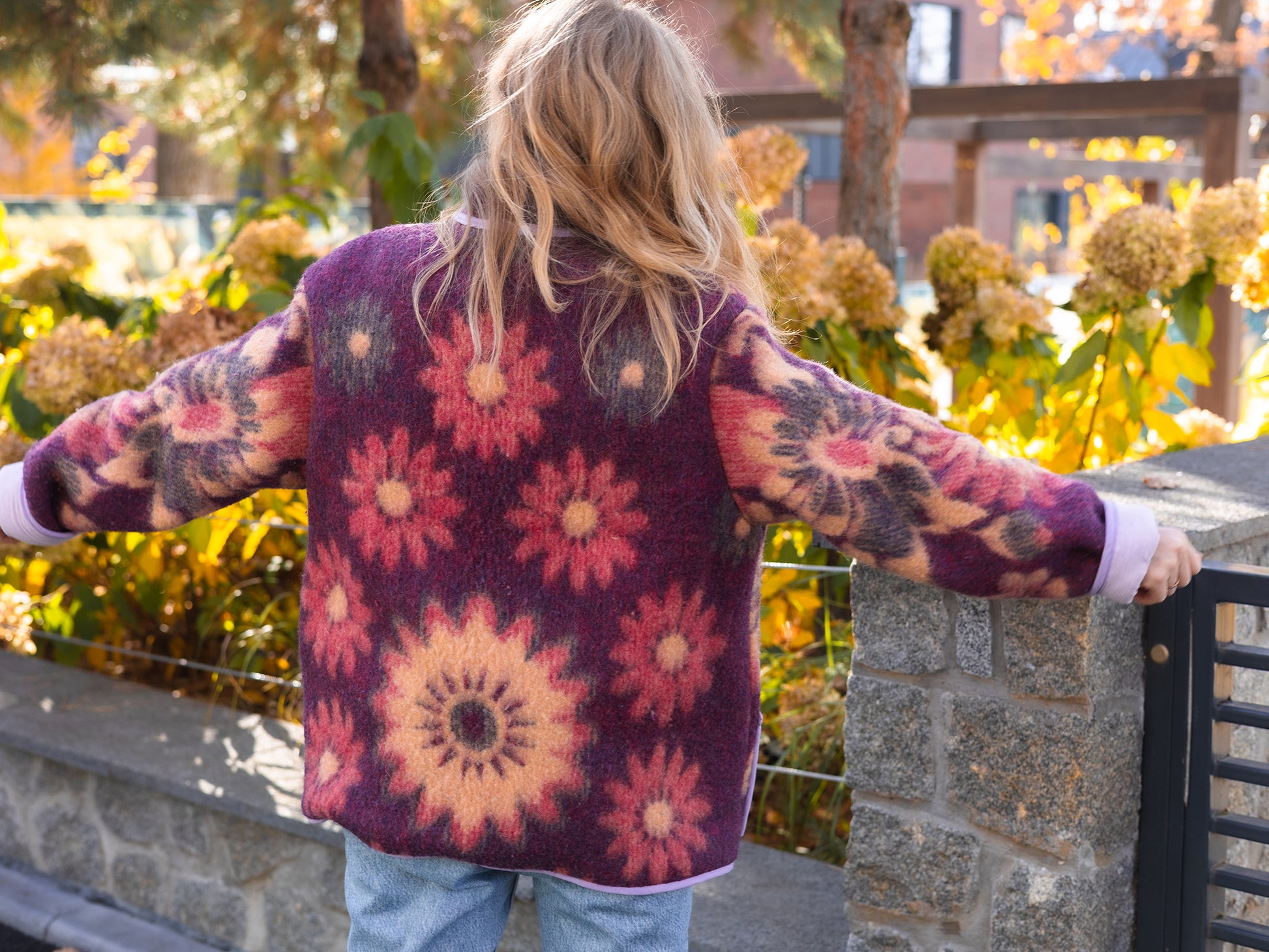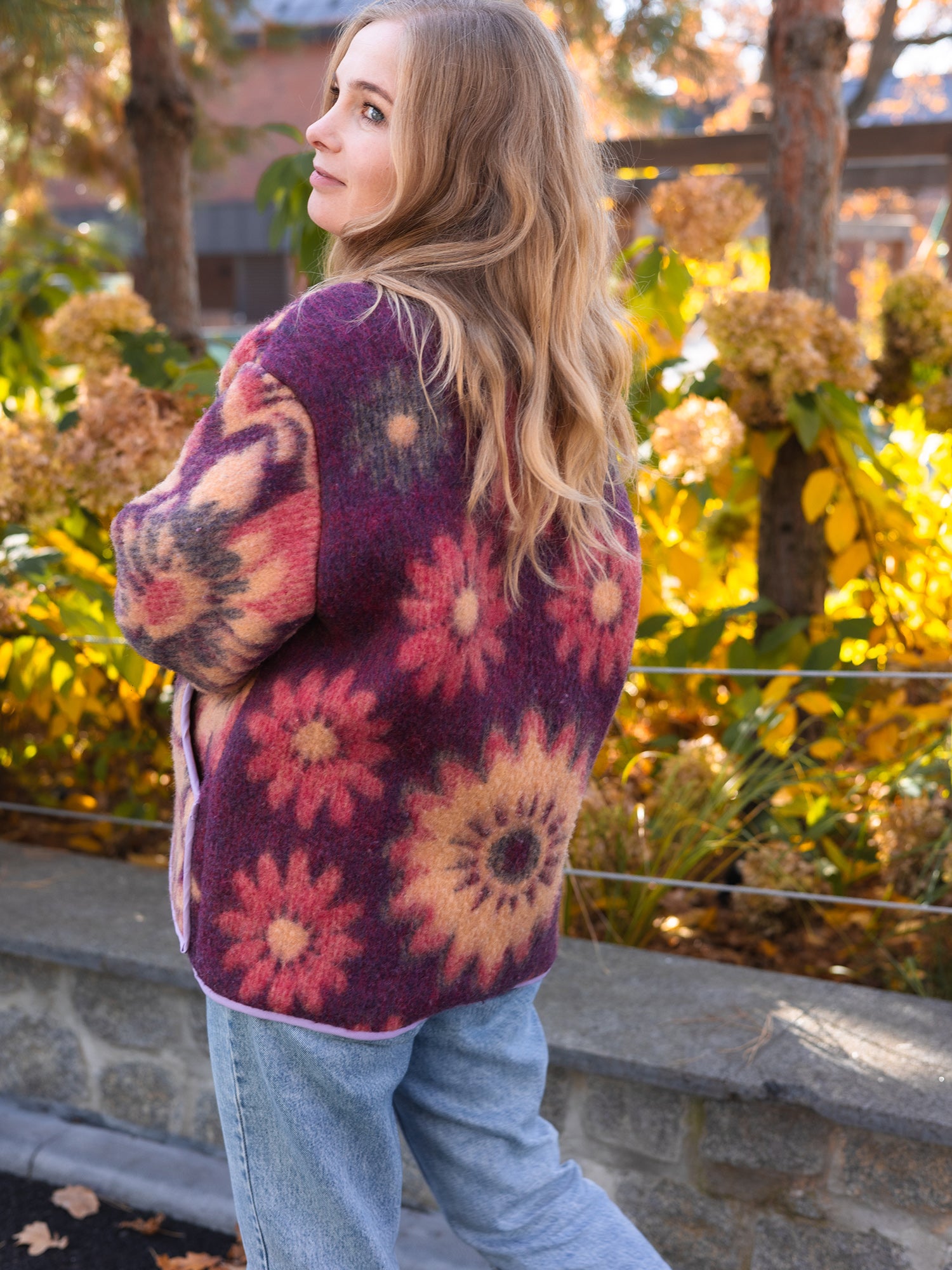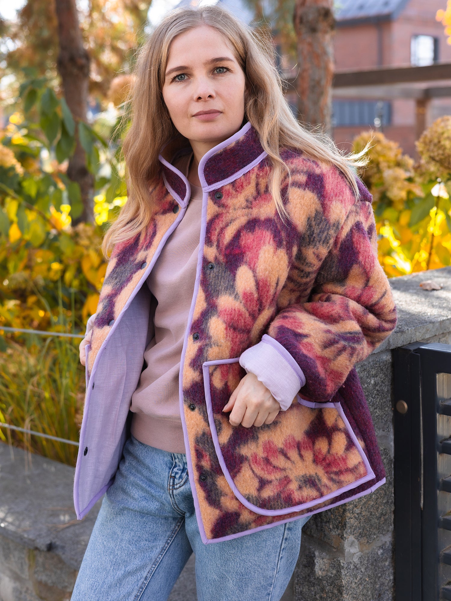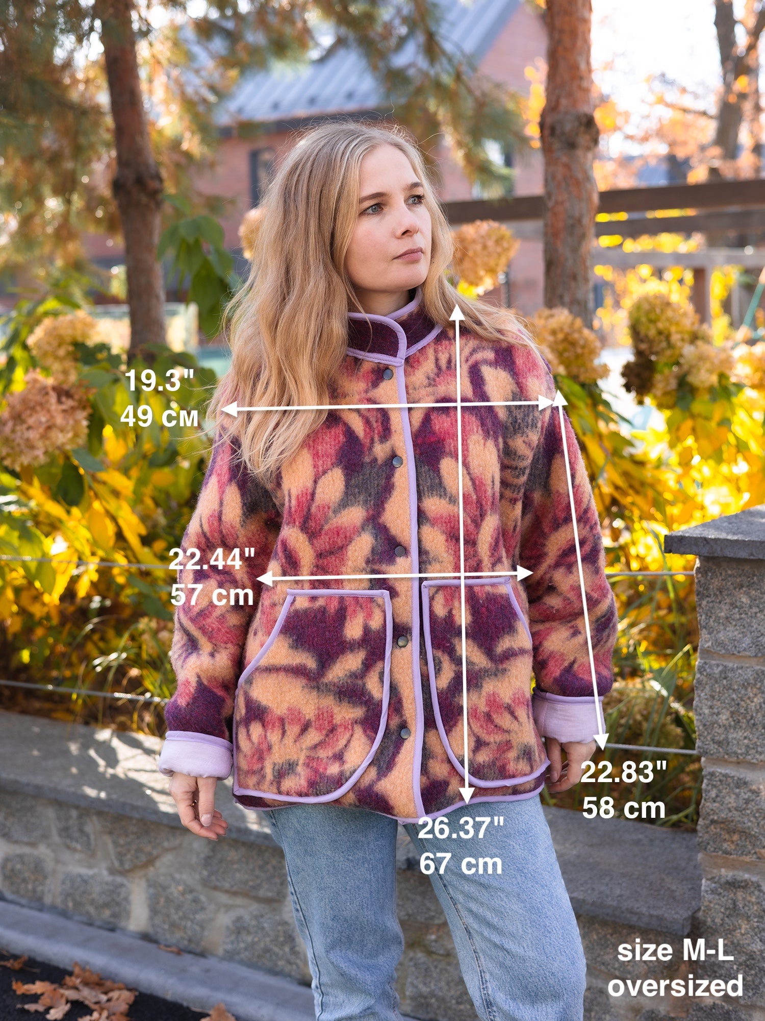 This one-of-a-kind jacket is handmade from a vintage Soviet wool blanket featuring a stunning floral pattern in deep purple, warm orange, and red hues. It’s designed in a relaxed, oversized fit (size M-L) with drop shoulders for maximum comfort and style.