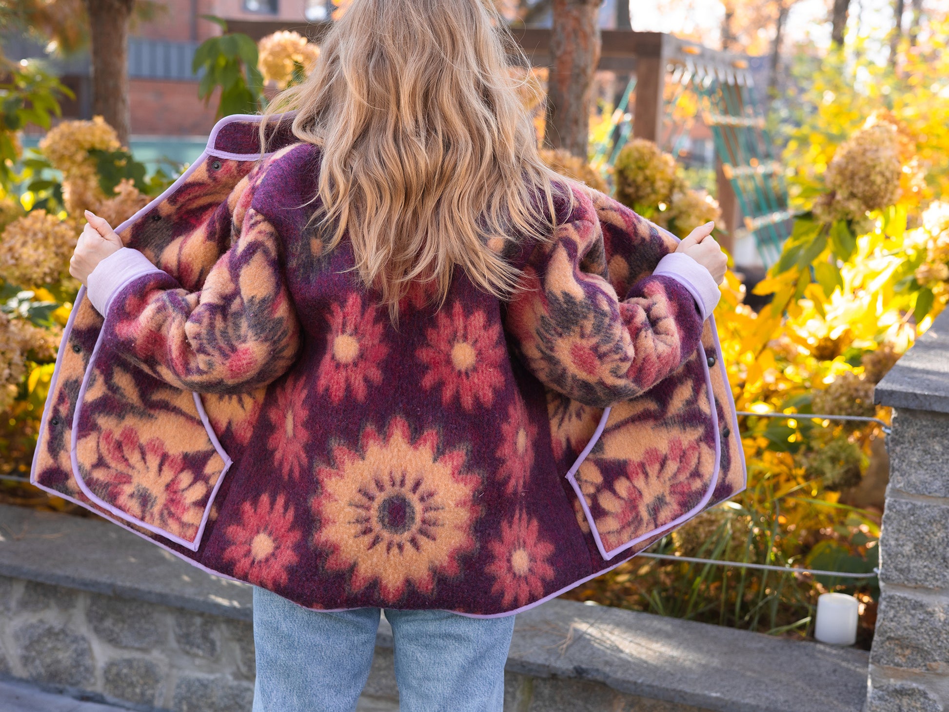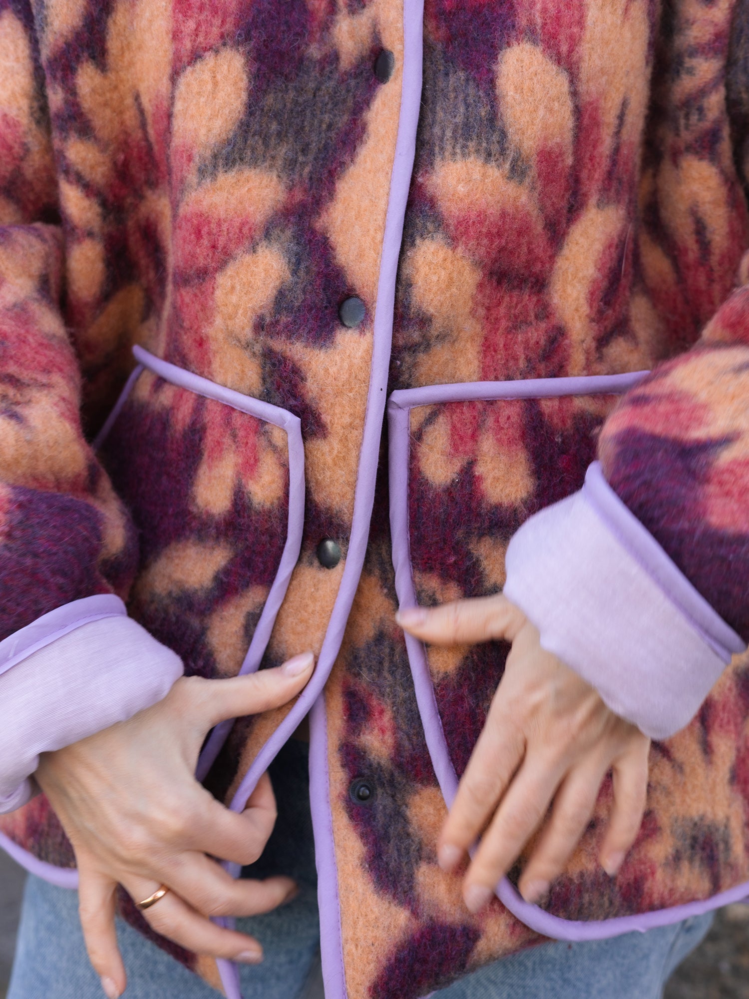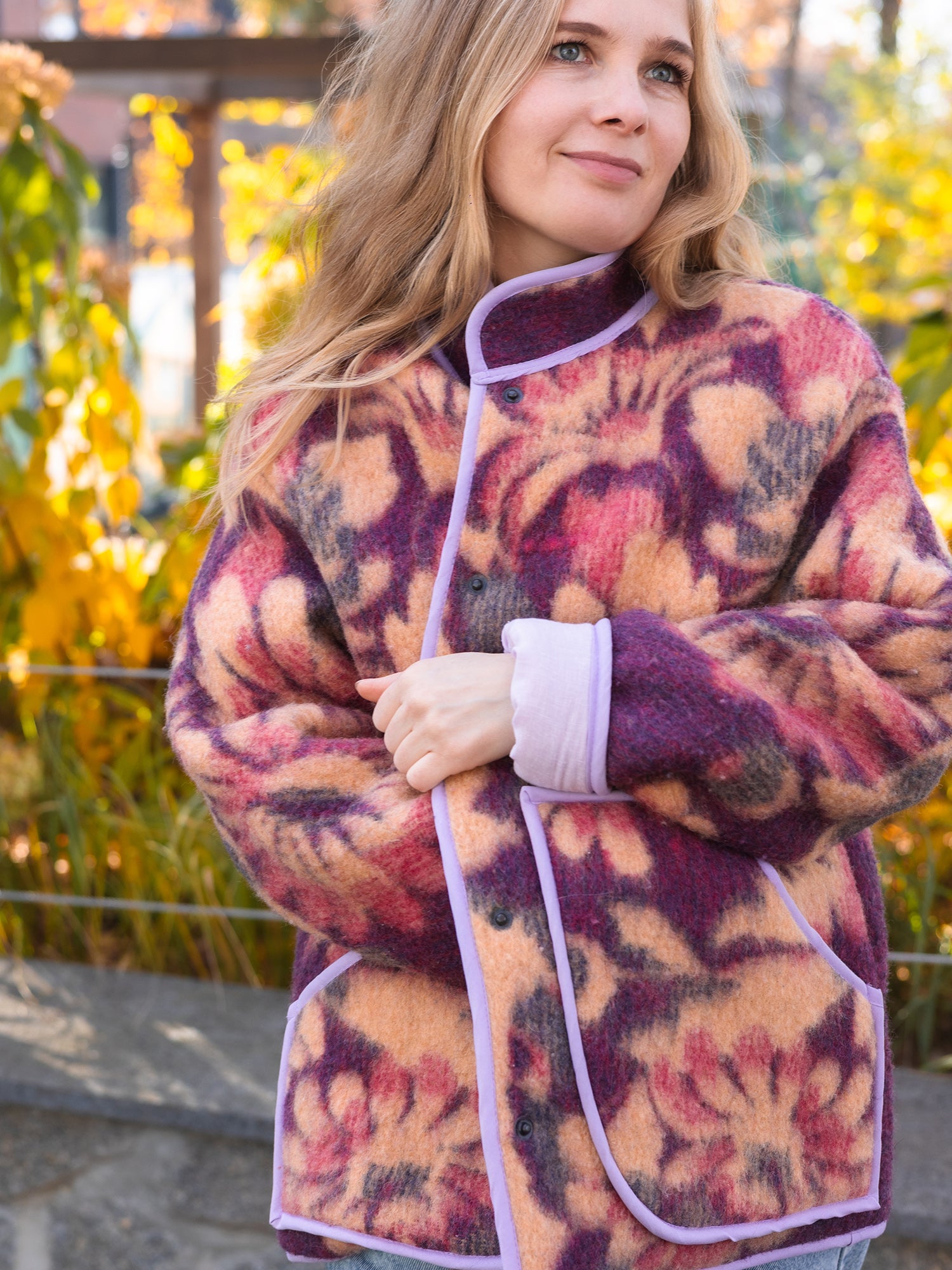 Upcycled Wool Blanket Jacket – Size M-L Oversized – Floral Purple & Orange – Lined with Lavender Cotton – Cozy Reversible Look