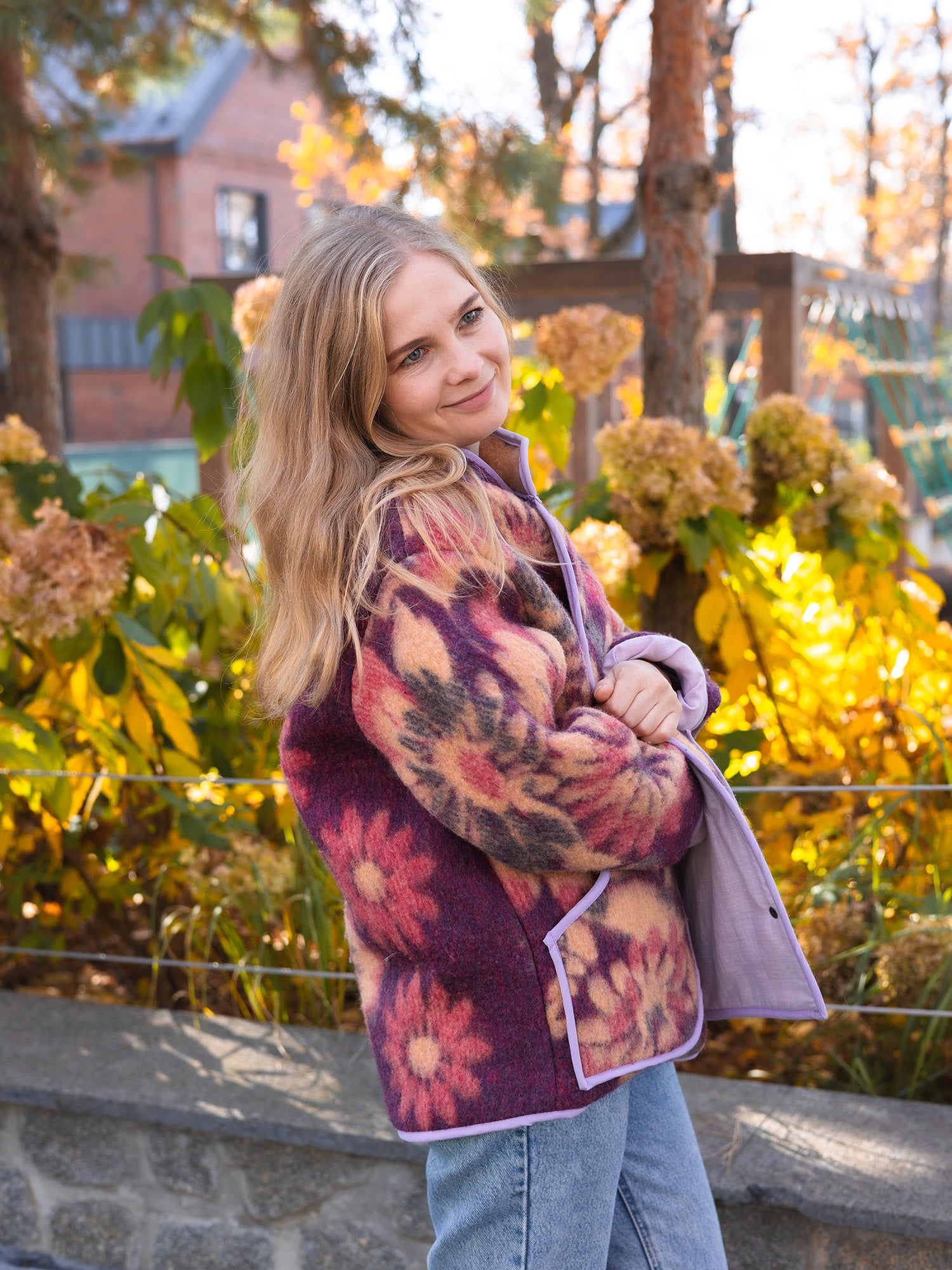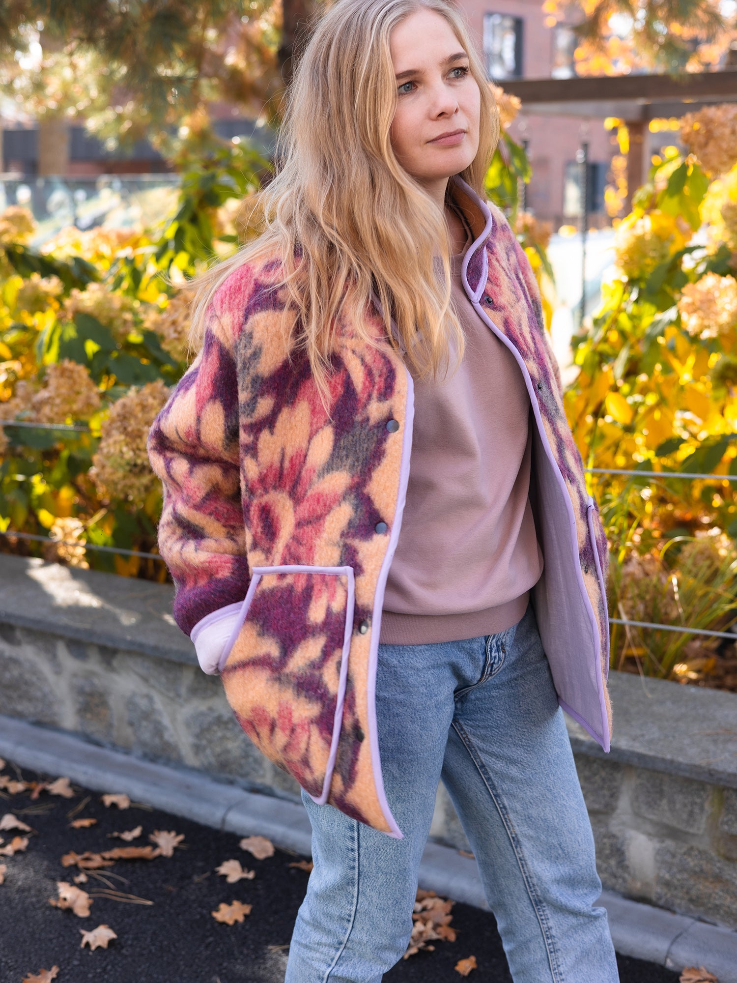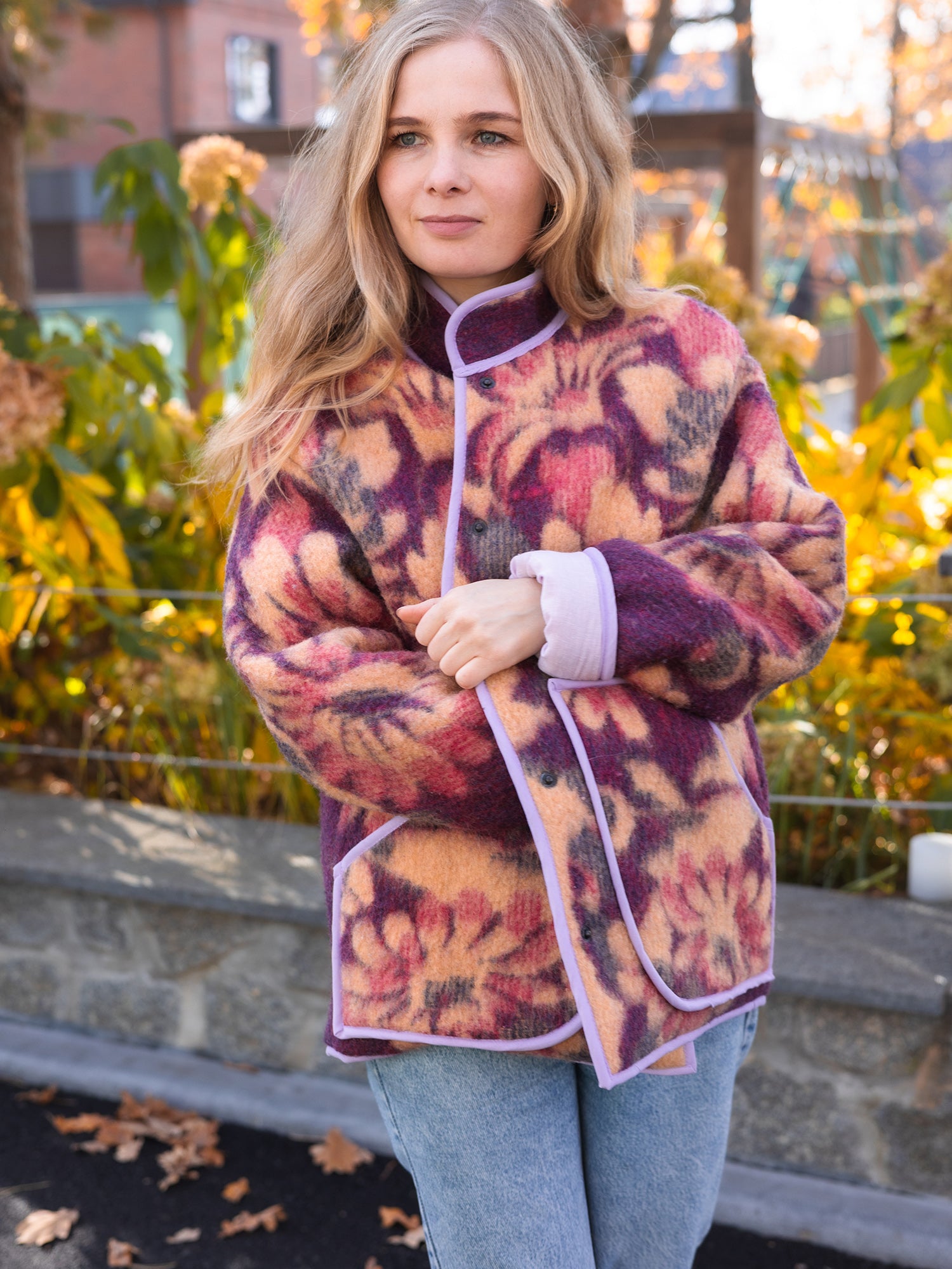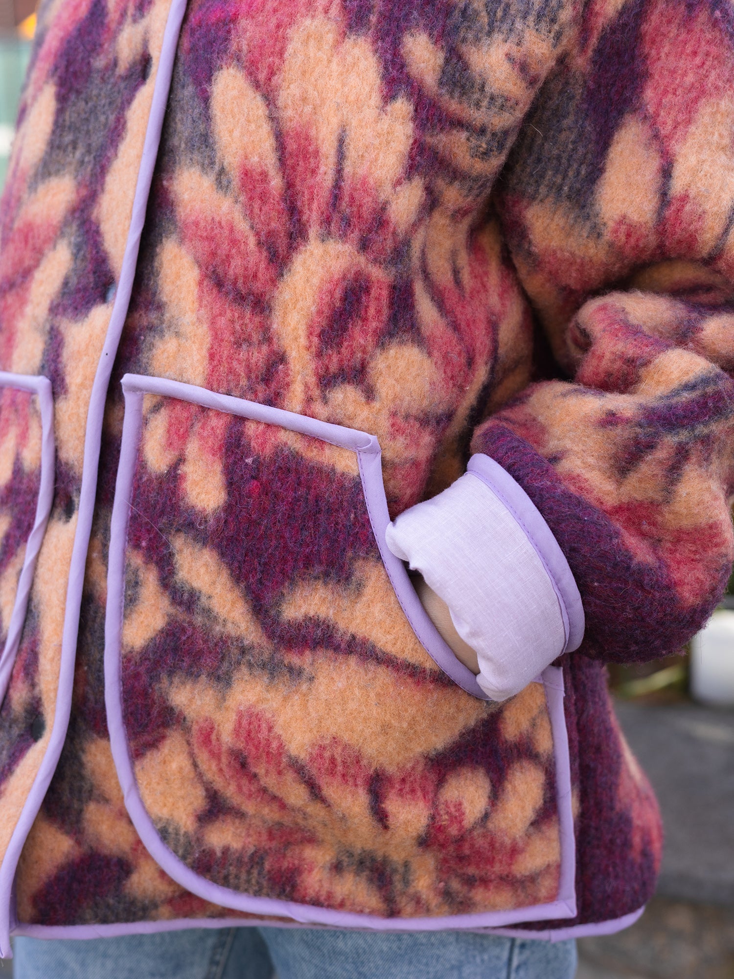 Upcycled Wool Blanket Jacket – Size M-L Oversized – Floral Purple & Orange – Lined with Lavender Cotton – Cozy Reversible Look